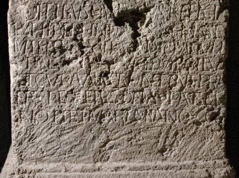 - Kante links verbr., bestoßen. Ältere Votivinschrift getilgt.