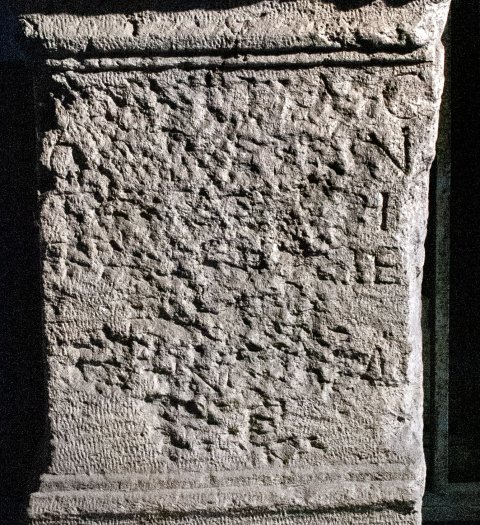 - Inschrift z.gr.Teil abgearbeitet, ältere Inschrift überschrieben (?), rechte Seite verbr.