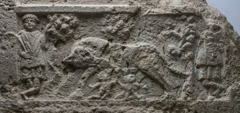 - Mythos : im Sockelbild Lupa Capitolina zwischen zwei Bäumen, seitlich stehende Männer, der linke in kurzer Ärmeltunica, in der Rechten Pedum (Hirte), der rechte im Sagum, in der Linken Rolle (volumen). Hinter der Wölfin weiterer Baum. Oben Ansatz einer Pilasterbasis vom Rahmen des Schriftfeldes.