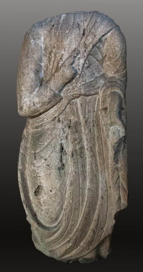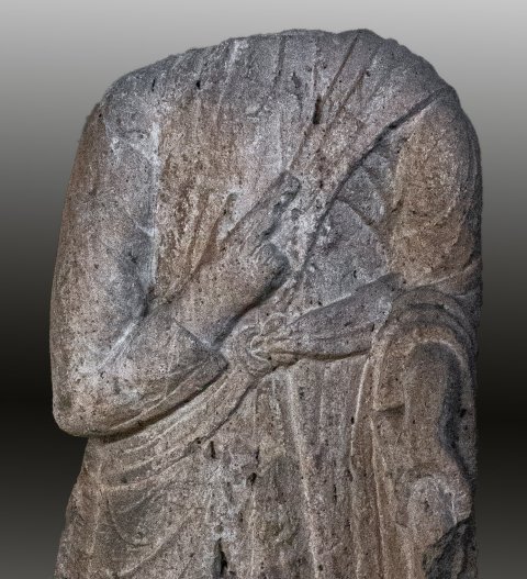 - Stehender Mann in Ärmeltunica und Toga. In der Linken Rolle (volumen). Zwischen linkem Ellbogen und rechter Hüfte gürtelartiger Stoffstreifen, vorn mit Schnalle geschlossen.
