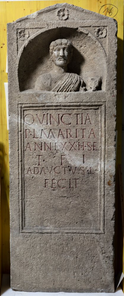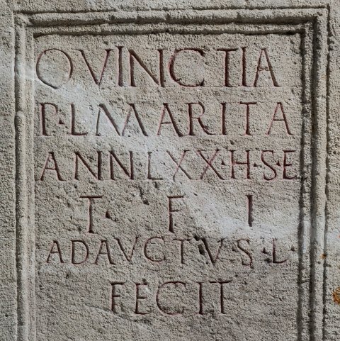 - Quinctia / P(ubli) l(iberta) Marita / ann(orum) LXX h(ic) s(ita) e(st) / t(itulum) f(ieri) i(ussit) / Adauctus l(ibertus) / fecit