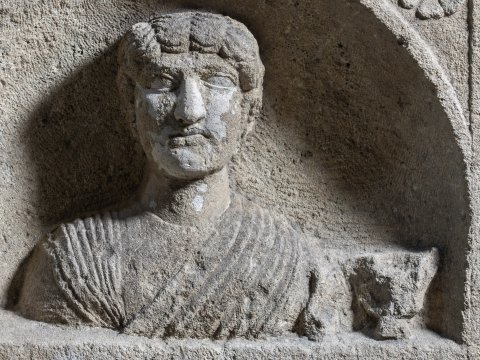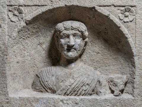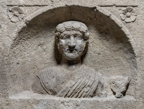 Im Hauptbild in Bogennische Brustbild einer Frau: julisch-claudische Frisur, Mantel. Rechts zwei Gefäße. Seitlich des Bogens Rosetten. - Inschrift