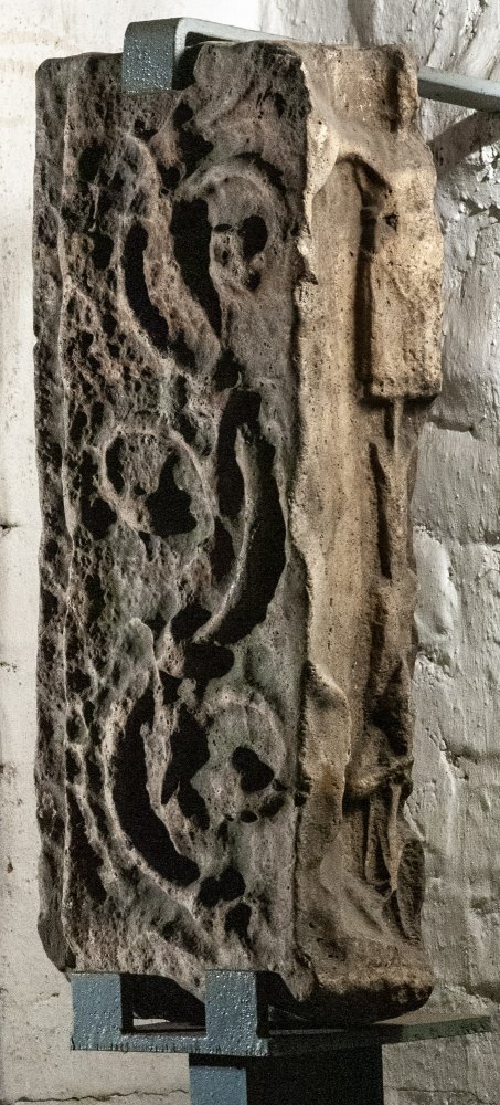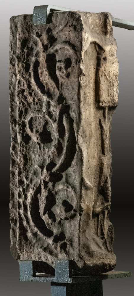 - oben u. rechts abgebr., verwaschen, an der hinteren Kante der Nebenseite Falz