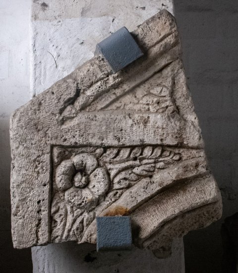 - Gerahmter Giebel mit Reliefrest (Blatt ?), darunter Ansatz von profiliertem Bogen, im Zwickel Rosette zwischen Blättern.