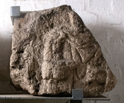 - Mann im Sagum, in der Linken Rolle (volumen). Rest einer Ganzfigur unter Bogen ?
