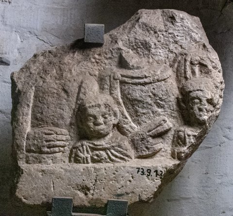 - Familie : Brustbilder von drei Erwachsenen (Frau, zwei Männer im Sagum mit Scheibenfibel) und zwei KIndern (Knaben im Sagum, der kleinere mit Apfel).