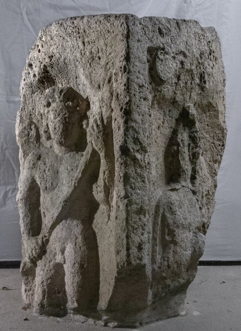 - Eckblock: auf der Vorderseite Reste einer Attis-Figur unter Bogen mit Volutenenden, auf der linken Nebenseite nackter geflügelter Genius (Erot) mit erhobener Fackel in den Händen.