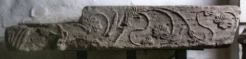 - Ranken mit Blättern, rechts stehender Vogel, links Rest eines Blattkelches (?), aus dem die Ranken herauswachsen.