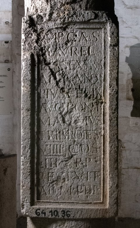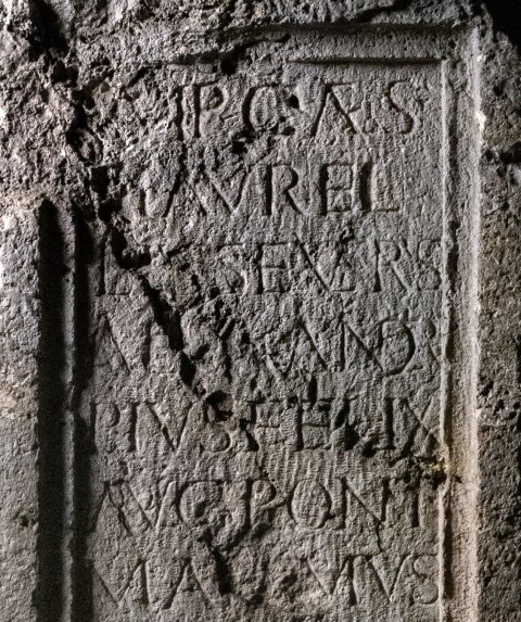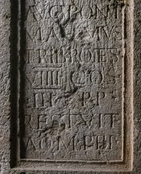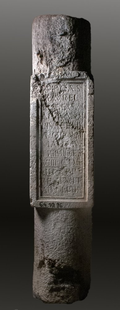 - [I]mp(erator) Caes(ar) / M(arcus) Aurel/lius Severus / Al[ex]ander / Pius Felix / Aug(ustus) pont(ifex) / ma[xi]mus / trib(unicia) <p=R>otest(ate) / VIIII co(n)s(ul) / III p(ater) p(atriae) / restituit / Aq(uinco) m(ilia) p(assuum) III
