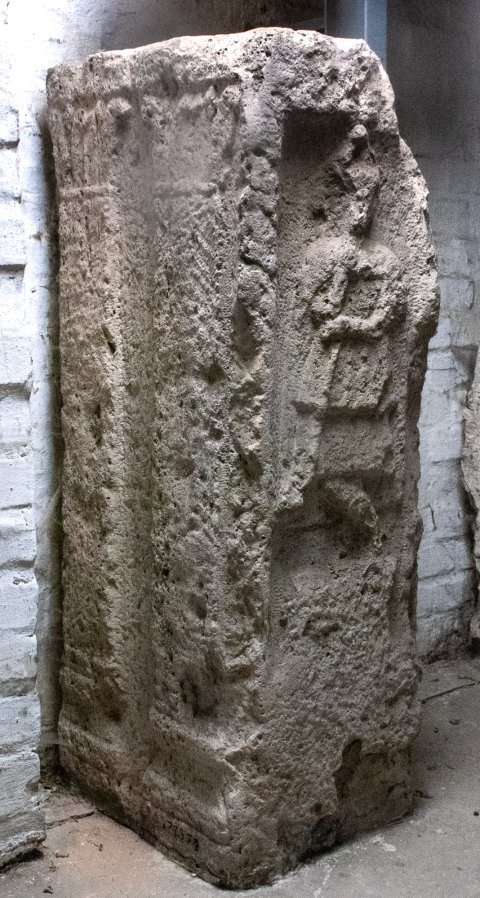 - Linker Eckblock eines Grabbaus: auf der Vorderseite auf hohem Podest mit gekreuzten Beinen stehender Attis, auf Pedum gelehnt. Auf der linken Nebenseite zwei glatte Pilaster mit Blattkapitellen, rechte Nebenseite geglättet.