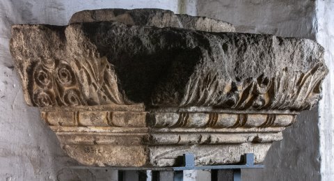 - Eckblock mit (von unten) Rundstab, Astragalstab, Akanthus-Spiralranken-Fries.