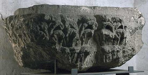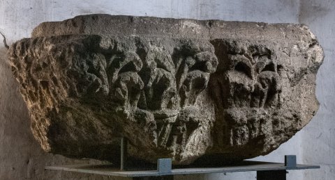 - Zwei dicht nebeneinander stehende Kapitelle mit zwei Blattkränzen und Volutenstängeln. Linkes Kapitell war Eckkapitell.
