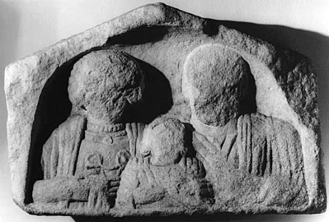 - Familie: in Giebelnische Brustbilder eines Ehepaares mit Kind. Links einheimische Frau: Haube,Umhang, Brustschmuck mit zwei Scheiben, Perlenkette, Halsreif mit Lunula, Armreif. Rechts Mann: bärtig, Tunica, Toga (?). Vorn Mädchen: offenes Haar, Ärmeltunica, in der Linken Vogel.