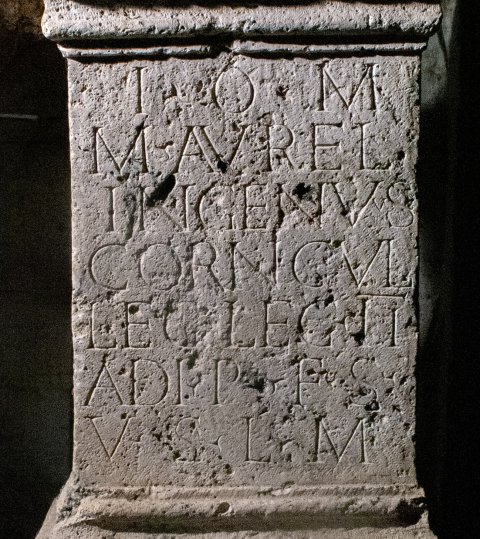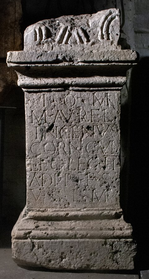- I(ovi) o(ptimo) m(aximo) / M(arcus) Aurel(ius) / Ingenuus / cornicul(arius) / leg(ati) leg(ionis) II / adi(utricis) p(iae) f(idelis) S(everianae) / v(otum) s(olvit) l(ibens) m(erito)