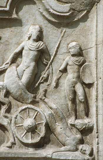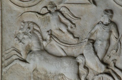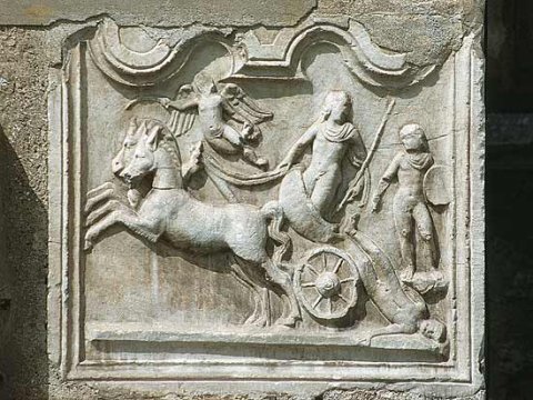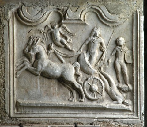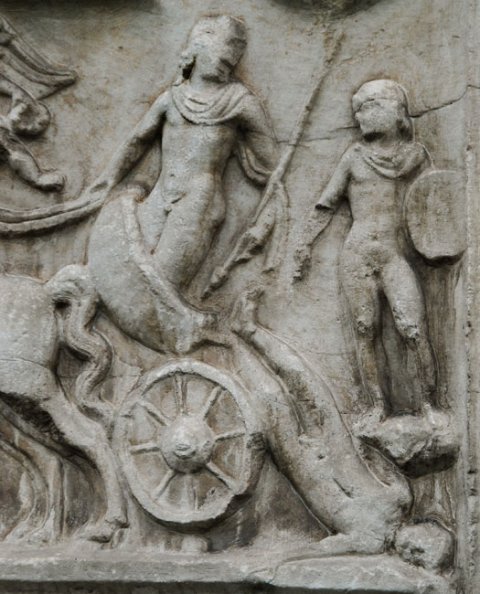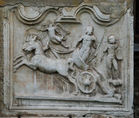 - Mythos (Troja): in Rechteckfeld mit geschwungenem obenen Rand Schleifung Hektors. Auf flacher Standleiste galoppierendes Zweigespann mit Streitwagen, darauf der zurückgewandte, bis auf den Mantel nackte Achill mit Lanze, über den Pferden fliegender Genius mit Zweig in der Rechten, Kranz in der Linken. Am Wagenkasten hängt die Leiche des Hektor, darüber auf einem eigenen Podest der Geist des Patroklos als Jüngling mit Mantel und rundem Schild.