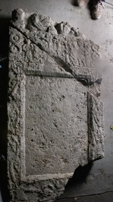 Auf der Rahmenleiste des eingetieften Schriftfeldes (sekundär abgearbeitet ?) Efeuranken. - Inschrift