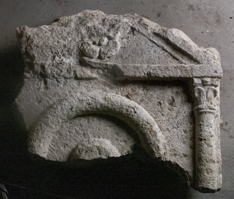 - Gerahmter Giebel mit Rosette. Hauptbild mit Kranz zwischen Säulen. Kranz u. Rosette darin nicht fertig ausgearbeitet.