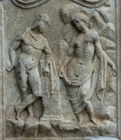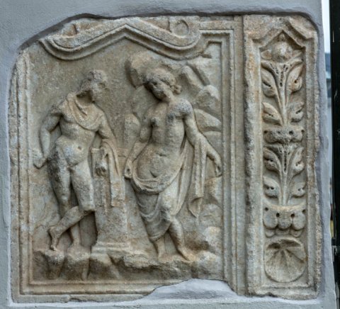 - Mythos : in Rechteckfeld mit Giebel rechts die vor Felsen stehende Andromeda, Mantel um Hüften und linken Arm, links Perseus mit Kappe, linken Arm auf Postament gestützt, in der Rechten hält er den Medusenkopf hinter seinen Rücken. Rechts schmales Seitenfeld mit Giebel, unten Muschel, darüber zwei Akanthusstauden.