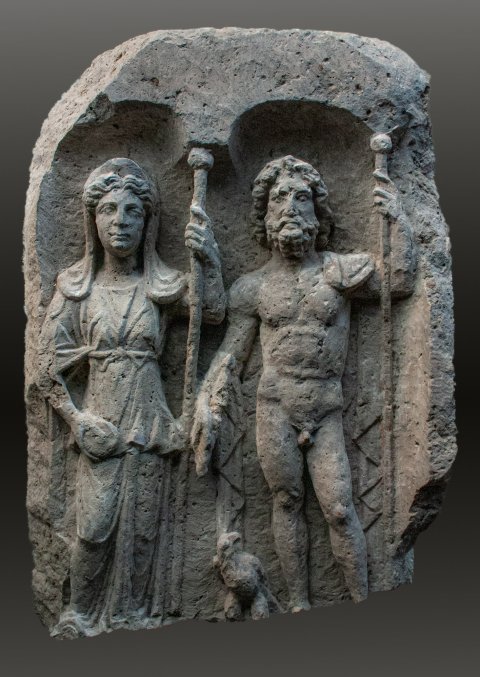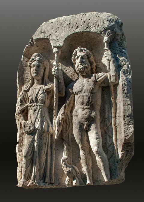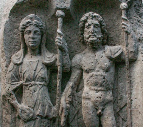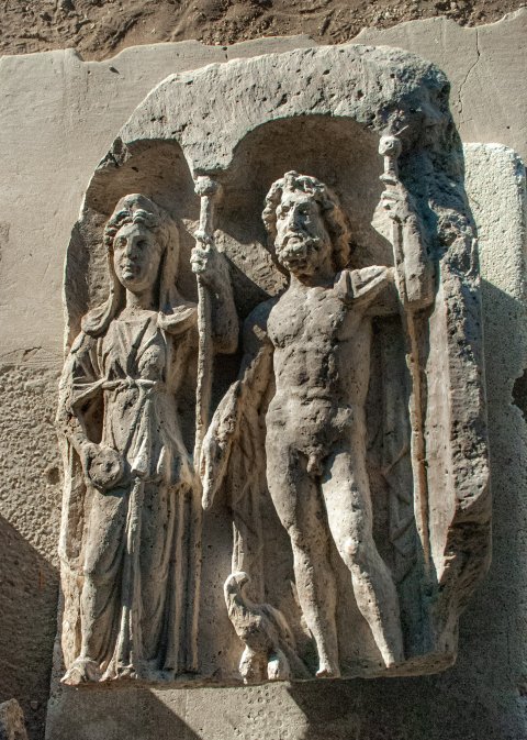 - Mythische Figur : einfach gerahmte Nische mit Doppelbogenabschluss. Links stehende Juno mit Diadem, langem Schleier, hochgegürtetem Chiton, in der Rechten Schale, in der Linken Szepter. Rechts Jupiter, nackt bis auf Mantel über linker Schulter, Rücken u. rechtem Arm, in der Rechten Blitzbündel, in der Linken Szepter. Neben seinem rechten Fuß Adler.