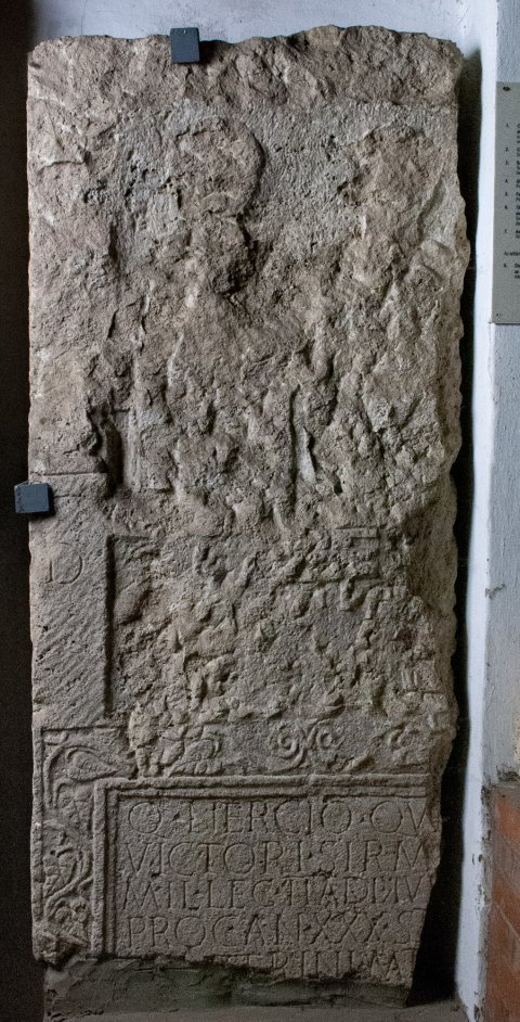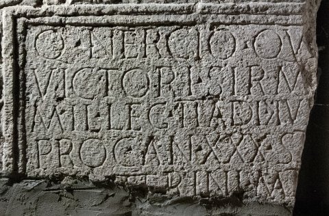 - D(is) [M(anibus)] // Q(uinto) Nercio Qu[ir(ina tribu)] / Victori Sirm[io] / mil(iti) leg(ionis) II adi(utricis) (centuria) Iu+[--] / Proc(uli) ann(orum) XXX st[ip(endiorum) --] / [---] Tetrini MAT[---] / [---] / [---