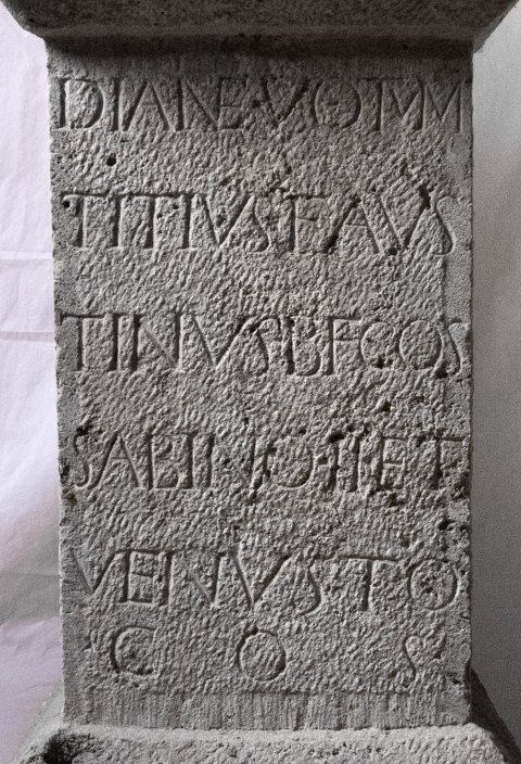 - Dian(a)e votum / Titius Faus/tinus b(ene)f(iciarius) co(n)s(ularis) / Sabino II et / Venusto / co(n)s(ulibus)