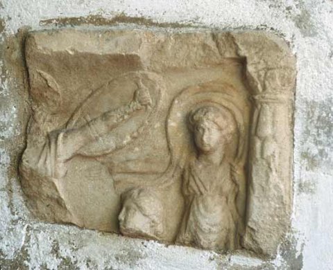- Mythos (Troja): Rechteckfeld mit seitlichen Schuppensäulen. Achill in Skyros. Rechts stehende Frau mit über dem Kopf geblähten Schleier, unterhalb Kopf einer knienden Frau, im Zentrum Achill in Frauenkleidung, am ausgestreckten linken Arm Schild.