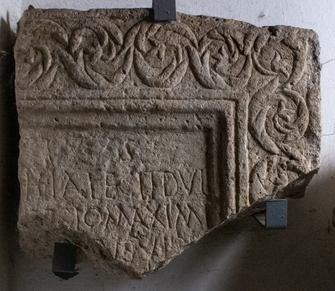 - Nur rechte obere Ecke der Inschrift erhalten, dazu 2. Fragment vom Rahmen. Ältere Inschrift getilgt.