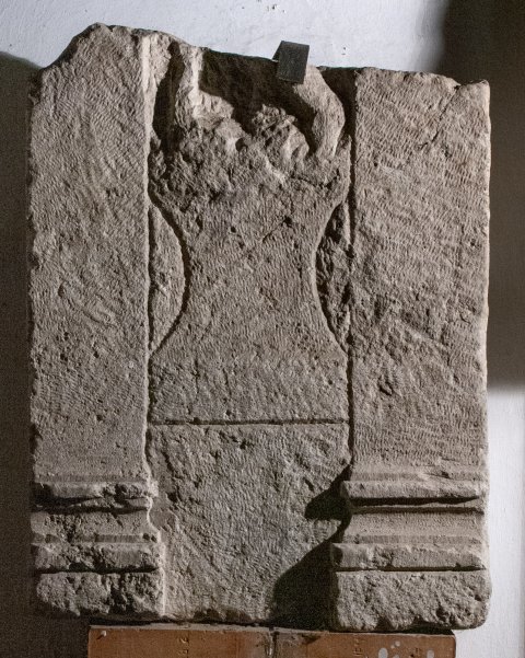 - Außenseite einer Aedicula-Seitenwange mit hohem Postament zwischen glatten Pilastern (profilierte Basen ausgeführt, Pilasterschäfte und Postament nur durch Ritzlinien angedeutet). Auf dem Postament Füße einer Figur mit gekreuzten Beinen (Attis ?).