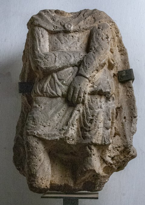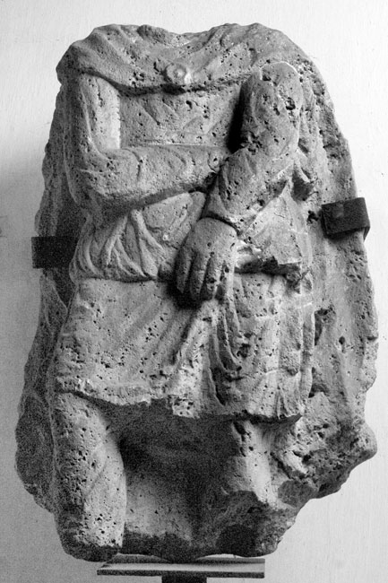 - Mythische Figur (Attis?, gefangener Orientale ?): stehender Mann in orientalischer Tracht mit Hosen, kurzem Ärmelgewand und Mantel, Arme vor dem Körper gekreuzt.