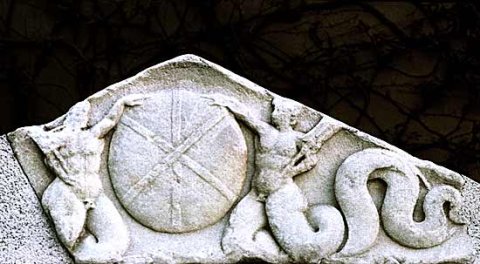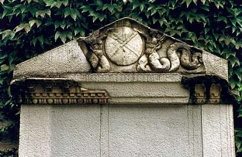 - Giebel mit Meerwesen: Clipeus mit gekreuzten Tänien, gehalten von zwei Tritonen mit Steuerruder im Arm.