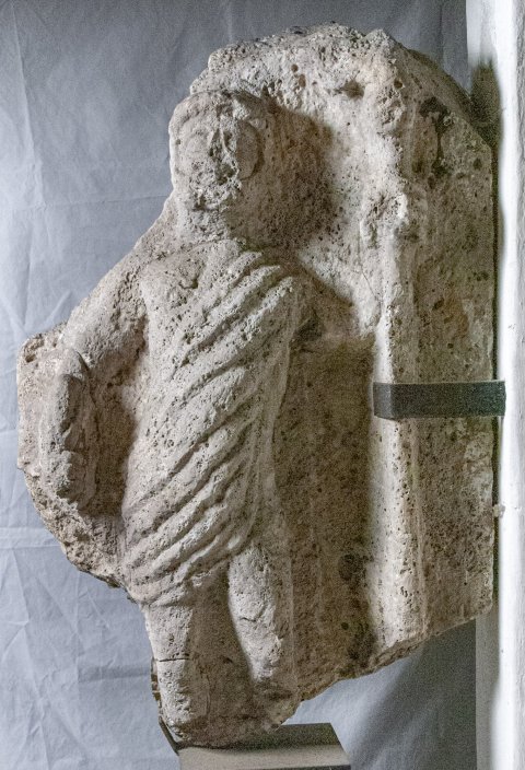 Mythische Figur. Auf zwei Seiten Reliefs. Seite a: stehender Jupiter, im kurzen Mantel, in der Rechten Blitzbündel, in der Linken Szepter.