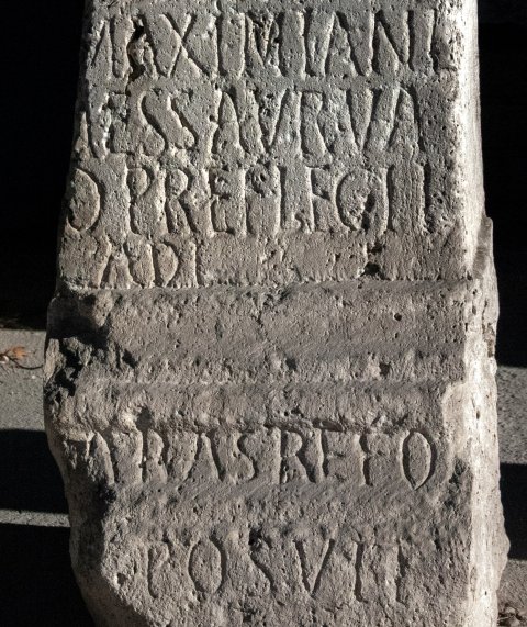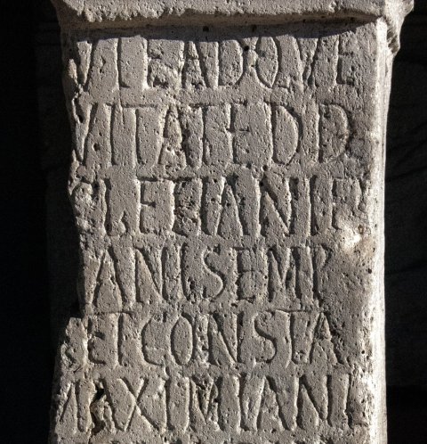 - [D(eo)] S(oli) M(ithrae) // [pro sal]ute adque / [aeq]uitate DD(ominorum) / [nn(ostrorum) Dio]cletiani et / [Maximi]ani semp(er) / [Augg(ustorum)] et Consta/[nti et] Maximiani / [nob(ilissimorum C]aess(arum) Aur(elius) Va/[lens] q(uondam) pr(a)ef(ectus) leg(ionis II / adi(utricis) // [---] aras refo/[vent(es)] posuit