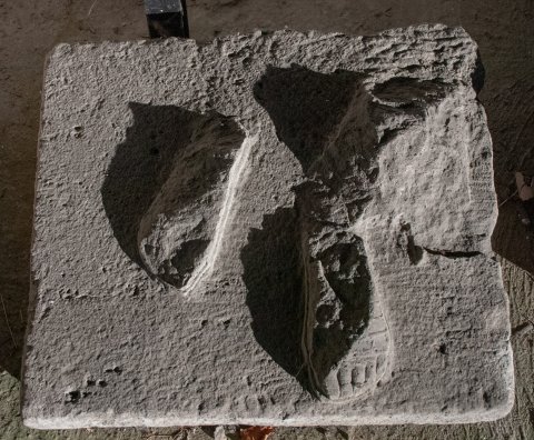 - Flache rechteckige Platte, darauf Füße in Sandalen (Göttin ?).