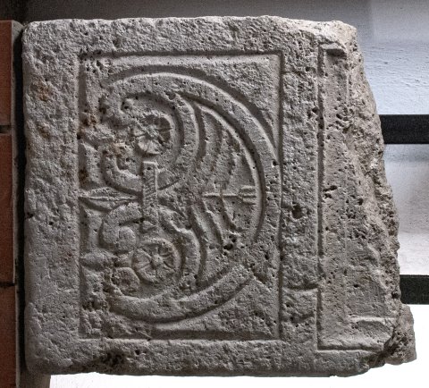 - Profilierter Rahmen eines Schriftfeldes, rechteckiges Seitenfeld mit Peltenhenkel mit Rosetten und Wellen mit Dreizack.
