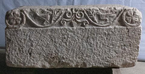 - Aufsatz eines Grabaltars ? Auf der Vorderseite untere zwei Drittel grob geglättet, darüber Reliefstreifen : Pulvini mit Rosetten, durch Ranken verbunden, in der Mitte Volutenornament mit herzförmigem Blatt. In den Rankenbögen je ein Vogel mit Zweig.