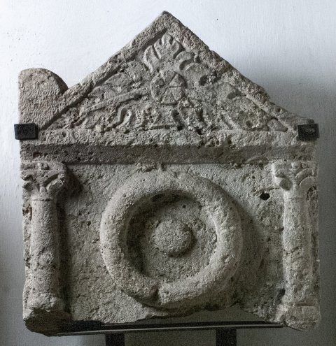 - Giebel mit Eckakroteren, im Giebelfeld Rosette zwischen Blättern. Im Hauptbild Kranz zwischen Säulen, im Kranz Rosette (unfertig ?).