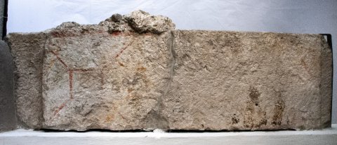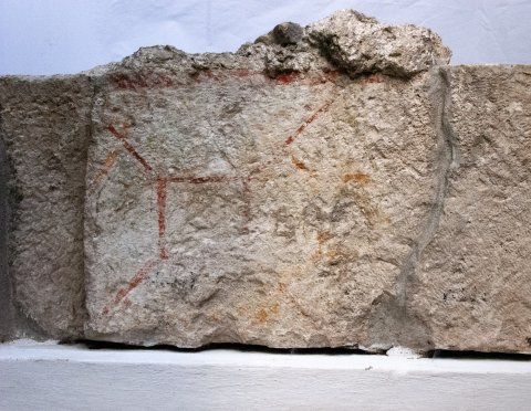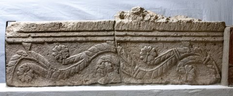 - Auf der Vorderseite an einer Längsseite profilierter Rahmen und Fries mit Blätterranke mit Blüten. Auf der Rückseite auf beiden Schmalseiten Falz, dazwischen rote Linien (Quaderimitation ?).