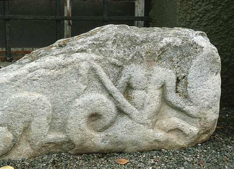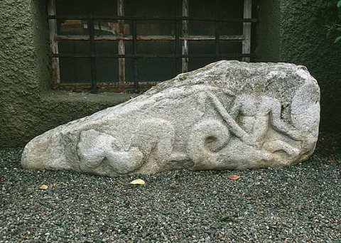 - Giebel mit Meerwesen: Kranz oder Medaillon zwischen Seekentauren. Der erhaltene trägt im rechten Arm einen Anker.