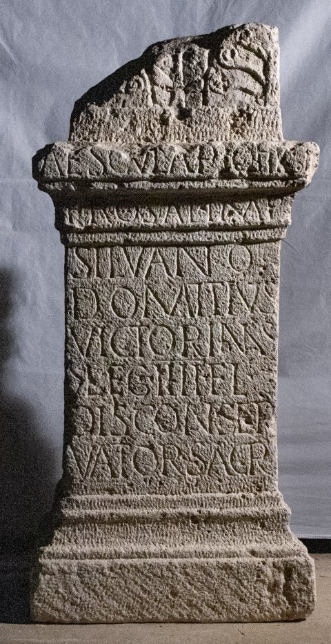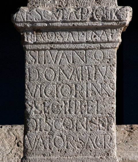 - Aesculapio Hygi(ae) // pro sal(ute) Imp(eratoris) // Silvano / Domitius / Victorinus / (centurio) leg(ionis) IIII Fl(aviae) / Dis Conser/vator(ibus) sacr(um)