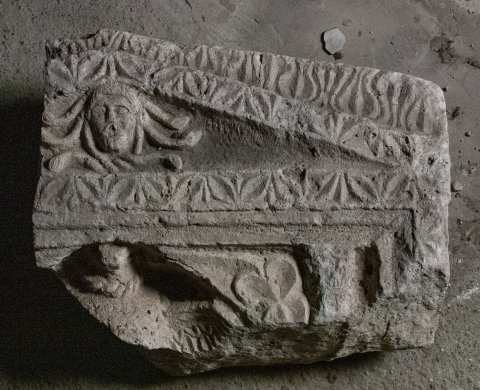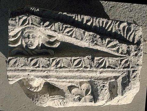 - Giebel mit Blattfriesen auf den Rahmenleisten, über den Schrägen stilisierter Palmettenfries. Im Giebelfeld Gorgoneion mit fliegenden Schlangenhaaren. Vom profiliert gerahmten Bildfeld nur obere rechte Ecke erhalten. Rechts Kapitell einer Säule, links daneben Rosette. In der Mitte (sekundär ?) eingetiefte rahmenlose Giebelnische mit Vogel (Adler) mit ausgebreiteten Schwingen (Kopf abgebr., um den Hals torquesartiger Wulst).