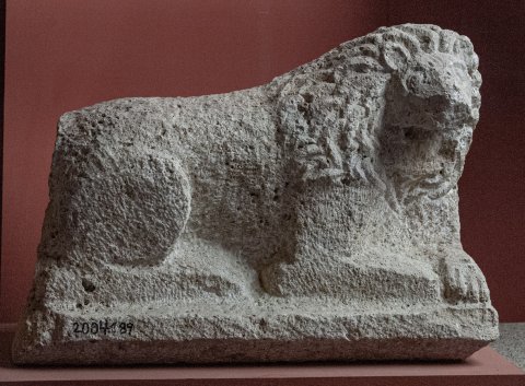 - auf abgeschrägter Basisplatte liegender Löwe mit nach rechts gedrehtem Kopf