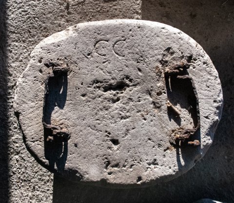 - halbkugeliger Stein mit ovaler Grundfläche, auf dieser zwei Eisengriffe und eingeritzte Gewichtsangabe.