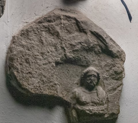 - Mythische Figur (Gott, Aesculap ? Silvanus ?): Oberkörper eines bärtigen Mannes mit Kappe (?), Mantel um linke Schulter und Taille gelegt.