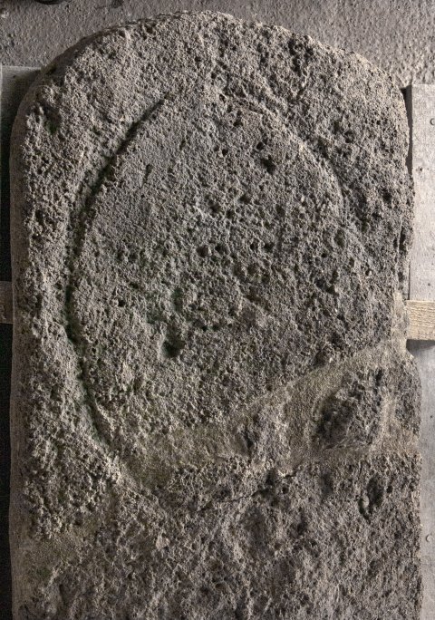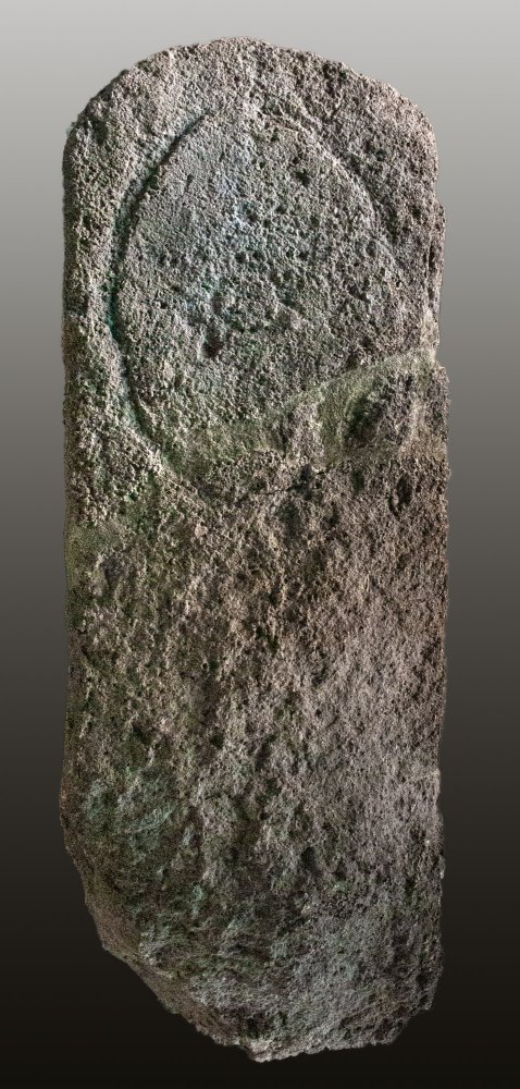 - Block oben bogenförmig, auf der Vorderseite eingeritztes Oval (Schild mit umbo). Pfeiler einer Grabeinfassung ?
