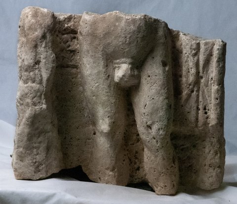 - Mythische Figur (Gott): frontal stehende nackte Männerfigur, an der rechten Hüfte herabhängender Mantel, neben dem rechten Oberschenkel Reliefreste.
