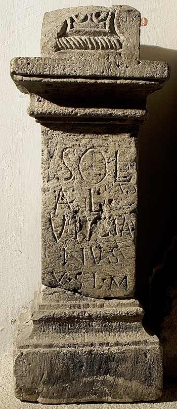 - S[o]l(i) Invic(to) / Aurel(ius) / Arbas / A[e]lia(?) / [-]in[--]/nina(?) // Sol(i) / Ael(ius) / Vi[ta?]lia/nus / v(otum) s(olvit) l(ibens) m(erito)
