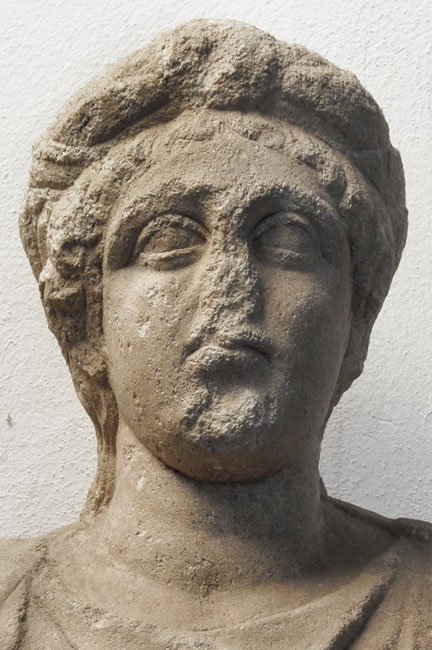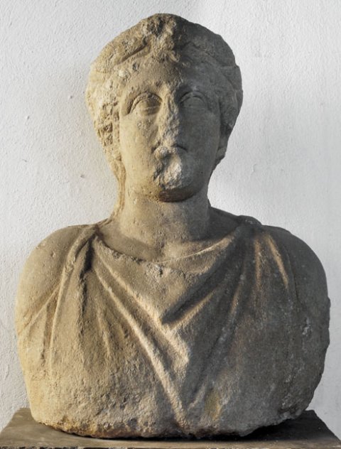 - Mythische Figur (Magna Mater?, Luna?, Nutrix ?) : mit einem Peplos bekleidete Büste einer Göttin, um den Kopf wulstige Binde mit Clipeus.