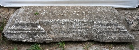 - An drei Seiten profilierte Platte mit Vorsprüngen für Pilaster auf der Längsseite. Basis- oder Zwischengesimsplatte eines Grabbaus.