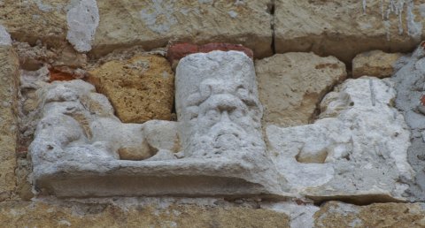 - Bärtiger Kopf mit Polos zwischen liegenden Löwen.