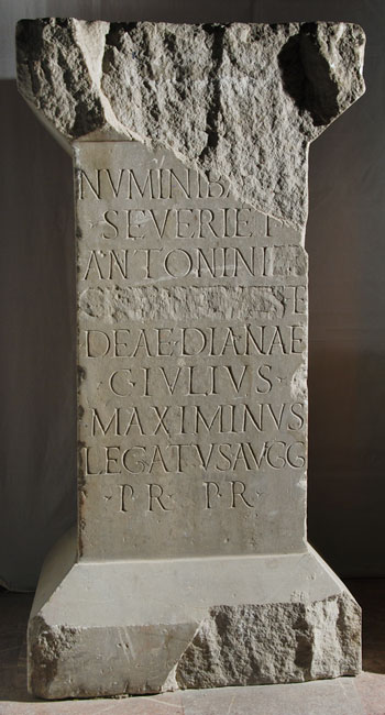 - Numinib(us) A[ugg(ustorum)] / Severi et / Antonini [[[et]]] / [[Ge[tae Cae]s(aris)]] et / deae Dianae / C(aius) Iulius / Maximinus / leg(atus) Augg(ustorum) / pr(o) pr(aetore)